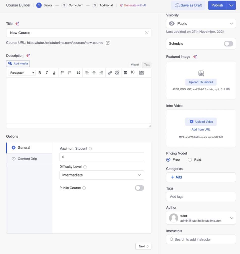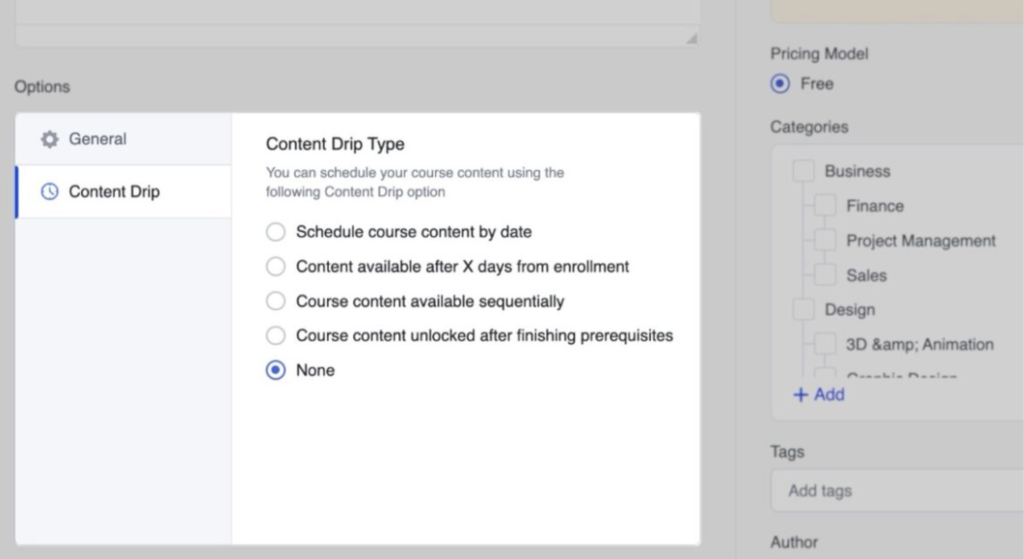 Rubrica autor afișează o listă a instructorilor înregistrați pe platforma LMS. Pur și simplu selectați instructorul corespunzător din listă pentru a-l atribui cursului.