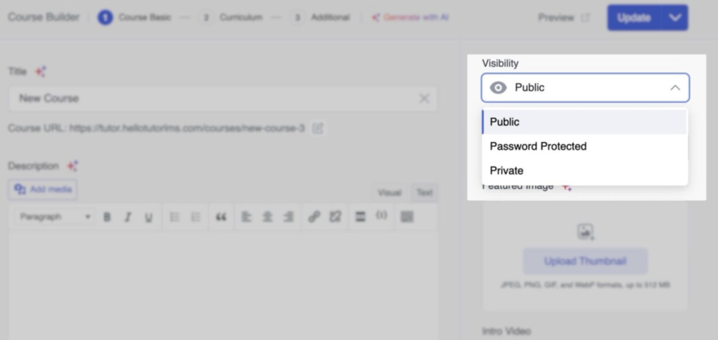 - Public: Oricine poate vedea și se poate înscrie la cursul dvs. Acesta va fi listat în catalogul cursurilor dvs. și va putea fi căutat pe site-ul dvs.