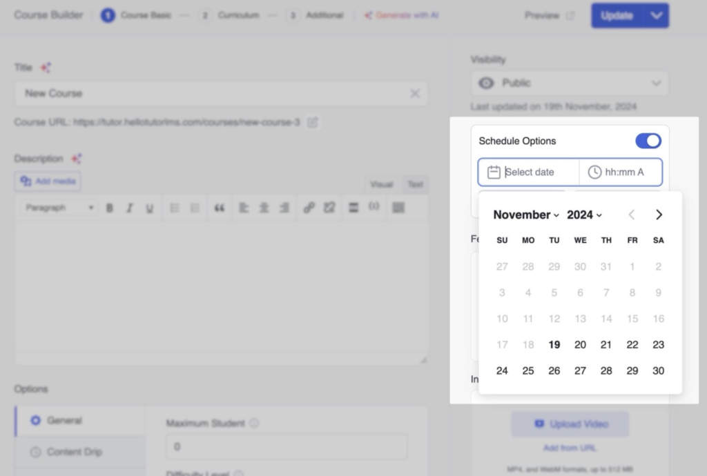 - Programați conținutul cursului în funcție de dată: Eliberați conținutul la date specifice, permițându-vă să creați un program predefinit.