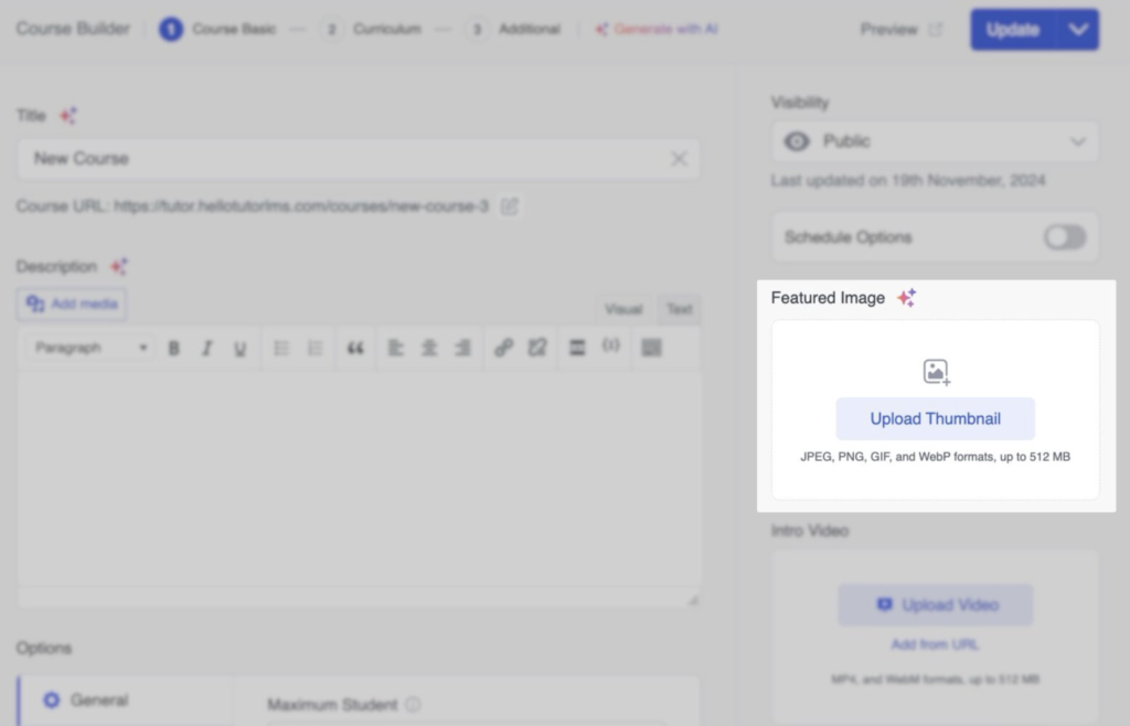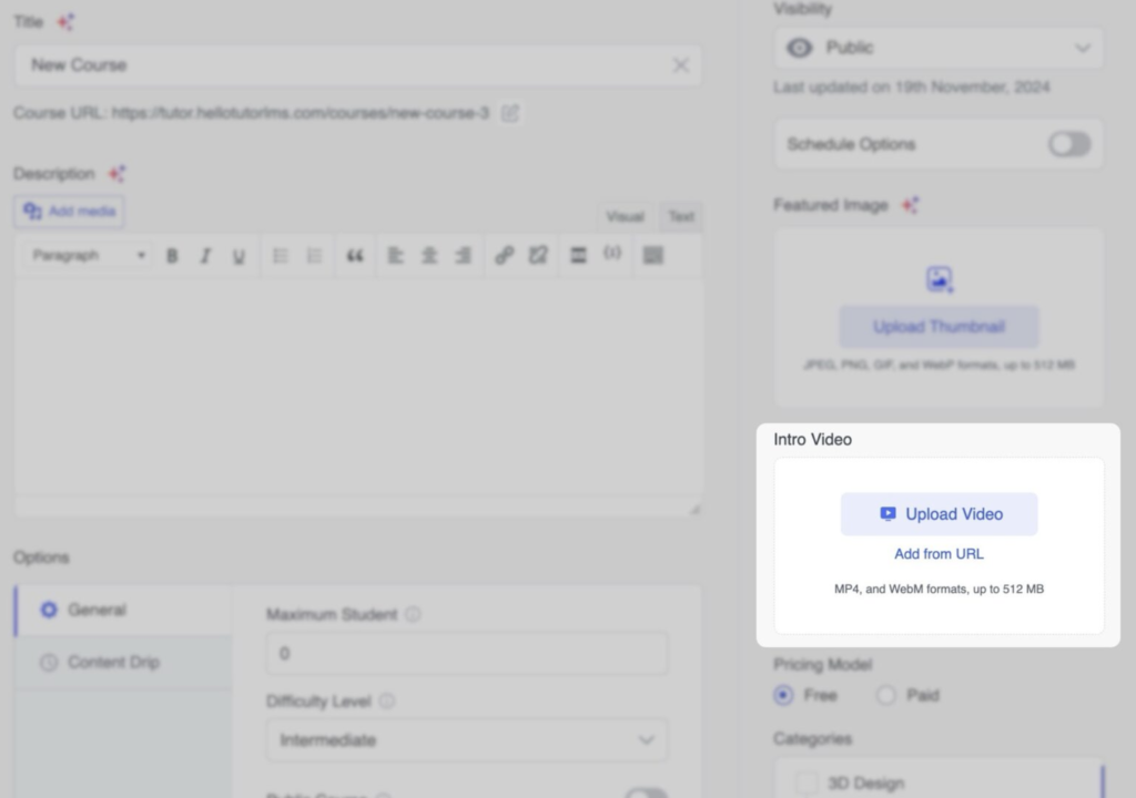 Secțiunea „Intro Video” vă permite să adăugați o introducere video la cursul dumneavoastră. Acest lucru oferă o notă de bun venit și permite potențialilor studenți să aibă o idee despre stilul dvs. de predare și conținutul cursului.