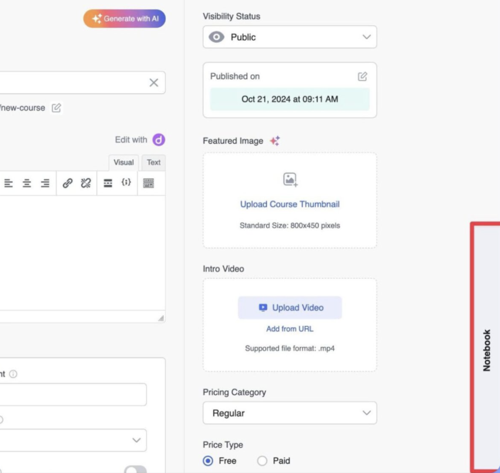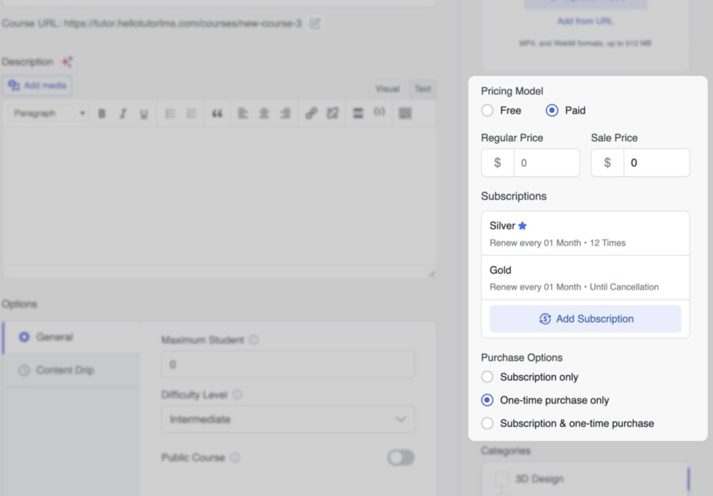 - Plătit: Stabiliți un preț pentru curs.