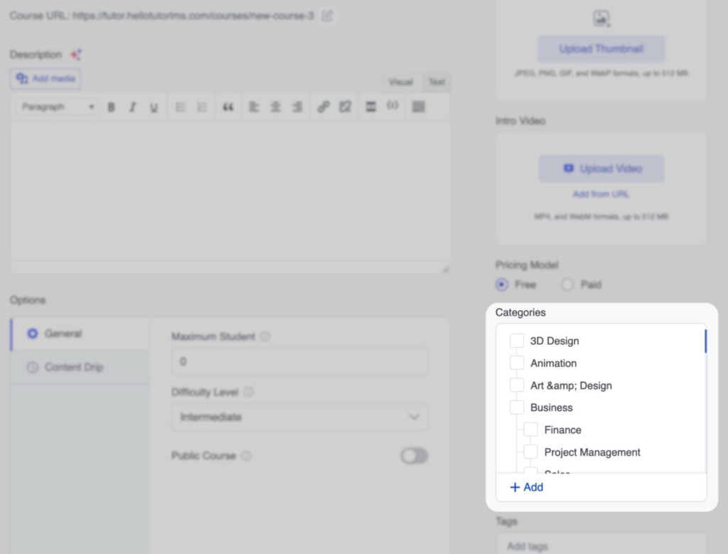 Folosind „Etichete” puteți adăuga cuvinte cheie relevante la cursurile dvs. Gândiți-vă la etichete ca la etichete care vă ajută să categorizați și să descrieți conținutul cursului. Acestea joacă un rol crucial în îmbunătățirea descoperirii cursurilor în cadrul site-ului dvs. de eLearning.