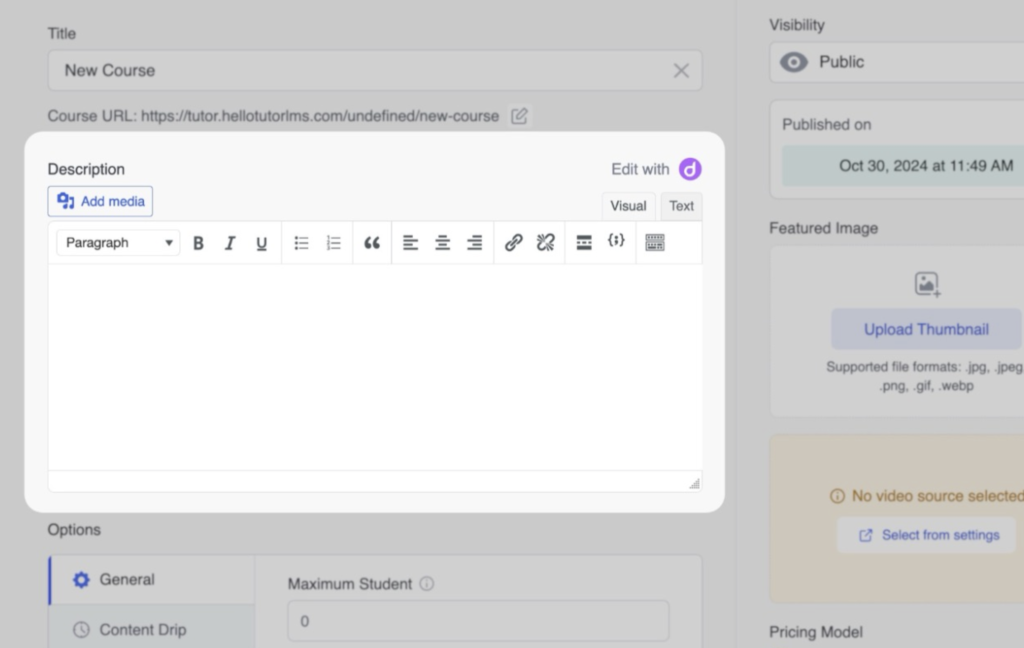 LMS oferă un editor de text bogat pentru a vă ajuta să formatați descrierea cursului dvs. Puteți: