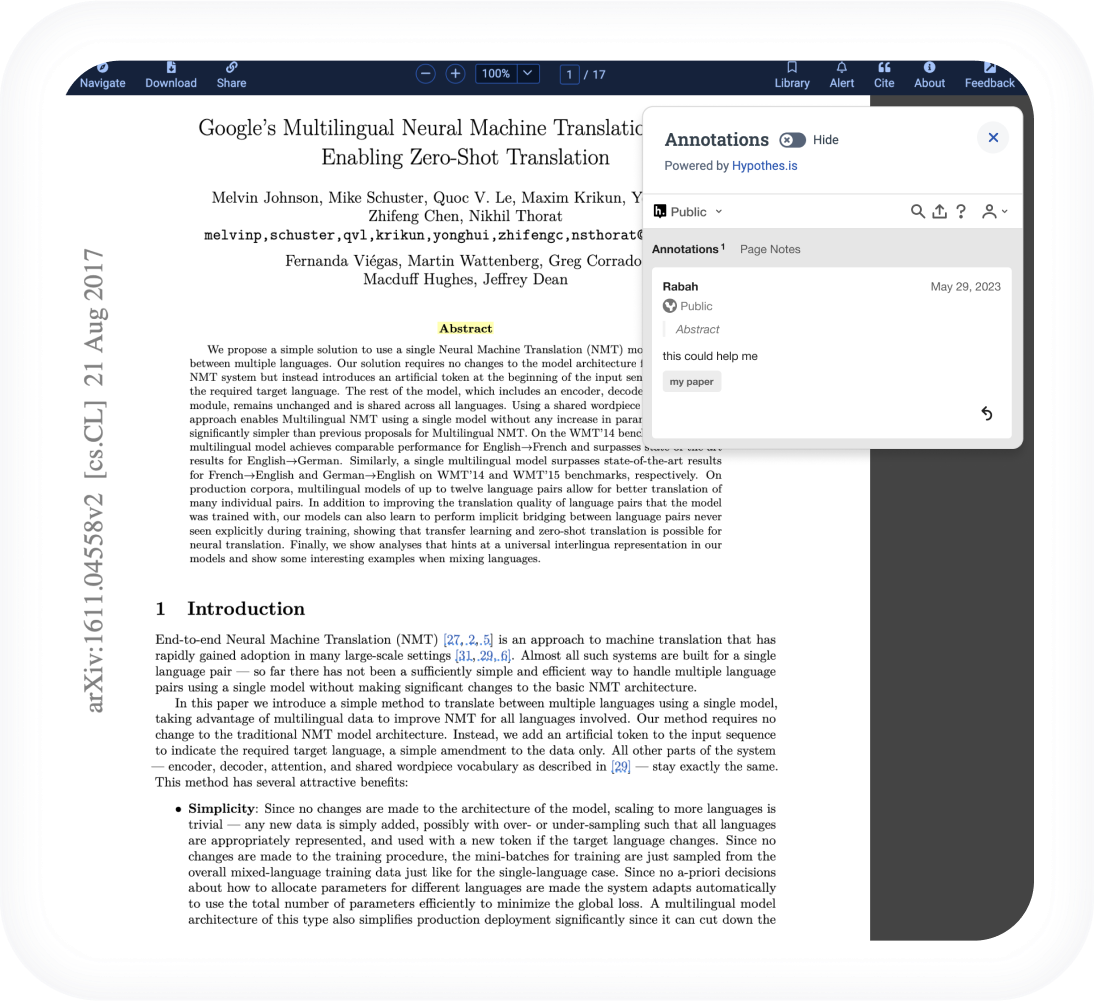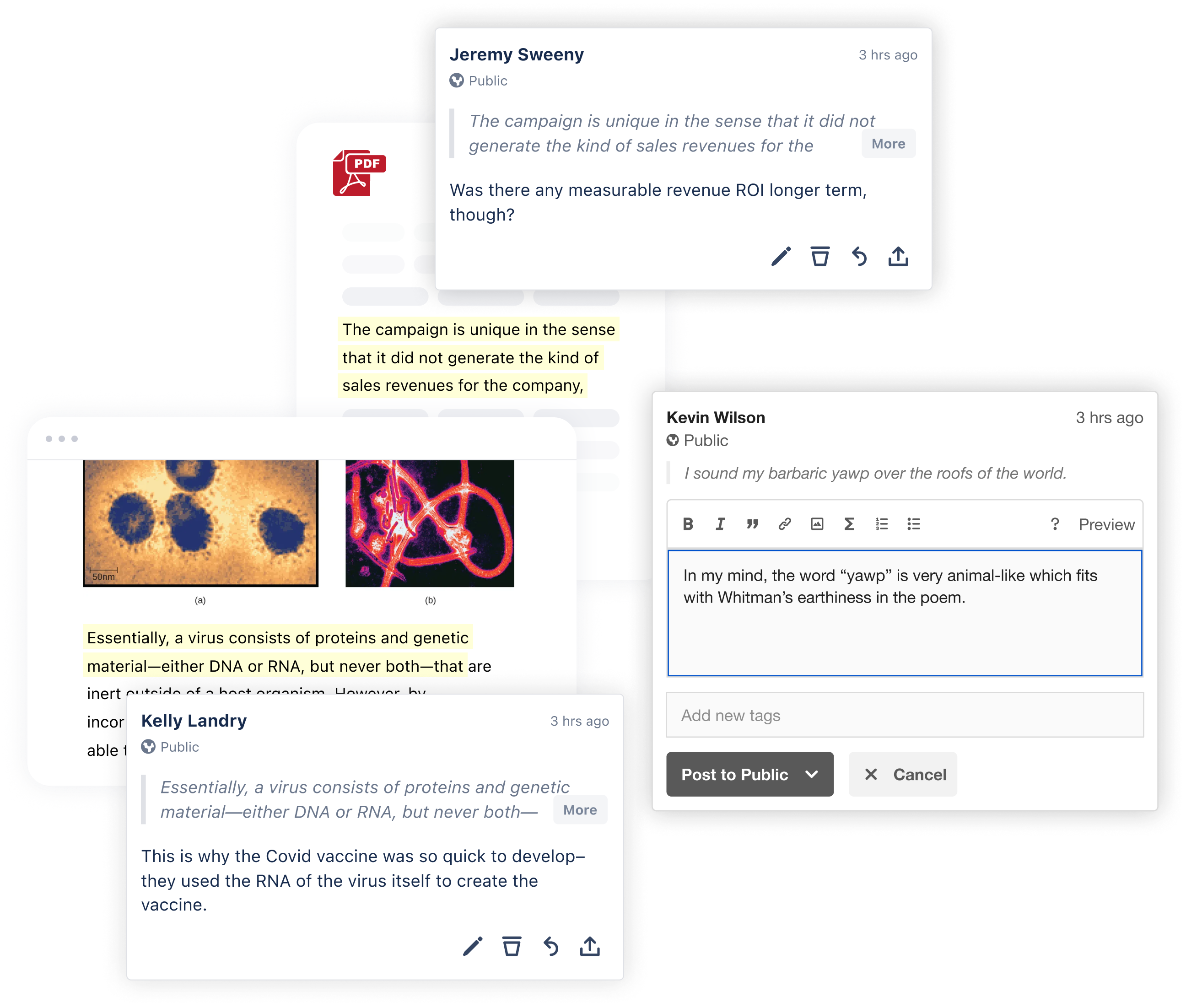 Adnotarea face ca lectura să fie mai activă și mai atractivă pentru clasele cu prezența la clasă, online și hibride. Permite studenților să evidențieze lecturile și să vizualizeze comentariile colegilor de clasă pentru a valida ideile și a face noi conexiuni.