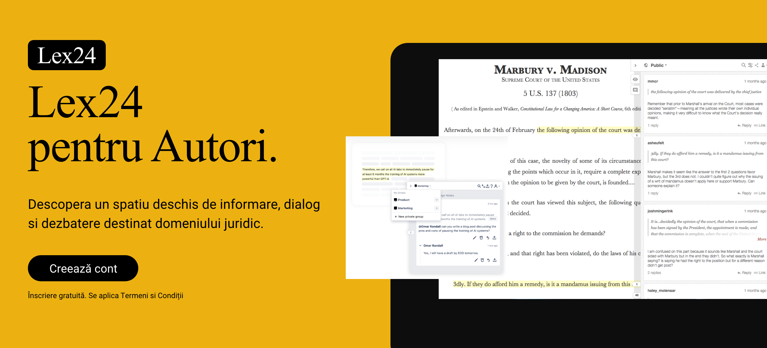 Invitați comunitatea la discuții și evaluari deschise. Pentru prima dată, autorii pot colecta feedback și pot obtine o evaluarea deschisă a materialelor lor direct pe conținutul publicat pe platforma Lex24.